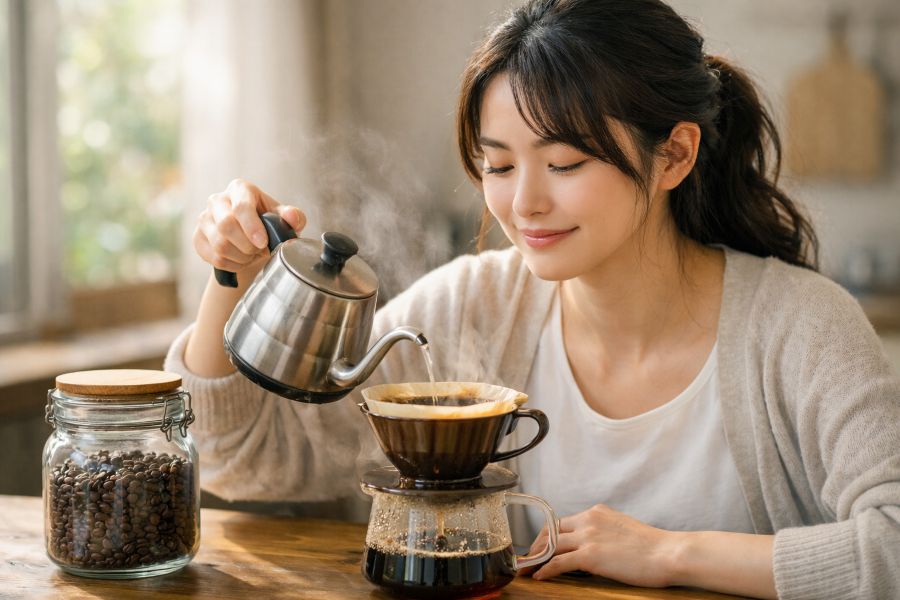 そして、コーヒー粉にお湯を入れを入れる際のポイントは、ちょっとお湯を注いでコーヒーの粉を蒸らすといいです。その後にお湯を注いでいけば美味しいコーヒーができますよ。